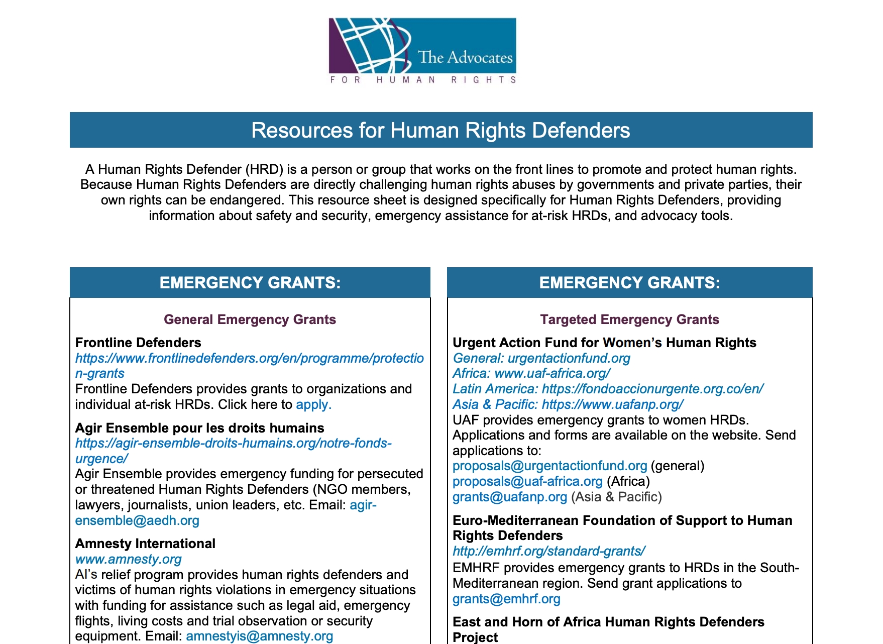 A Human Rights Defender (HRD) is a person or group that works on the front lines to promote and protect human rights. Because Human Rights Defenders are directly challenging human rights abuses by governments and private parties, their own rights can be endangered. This resource sheet is designed specifically for Human Rights Defenders, providing information about safety and security, emergency assistance for at-risk HRDs, and advocacy tools.
