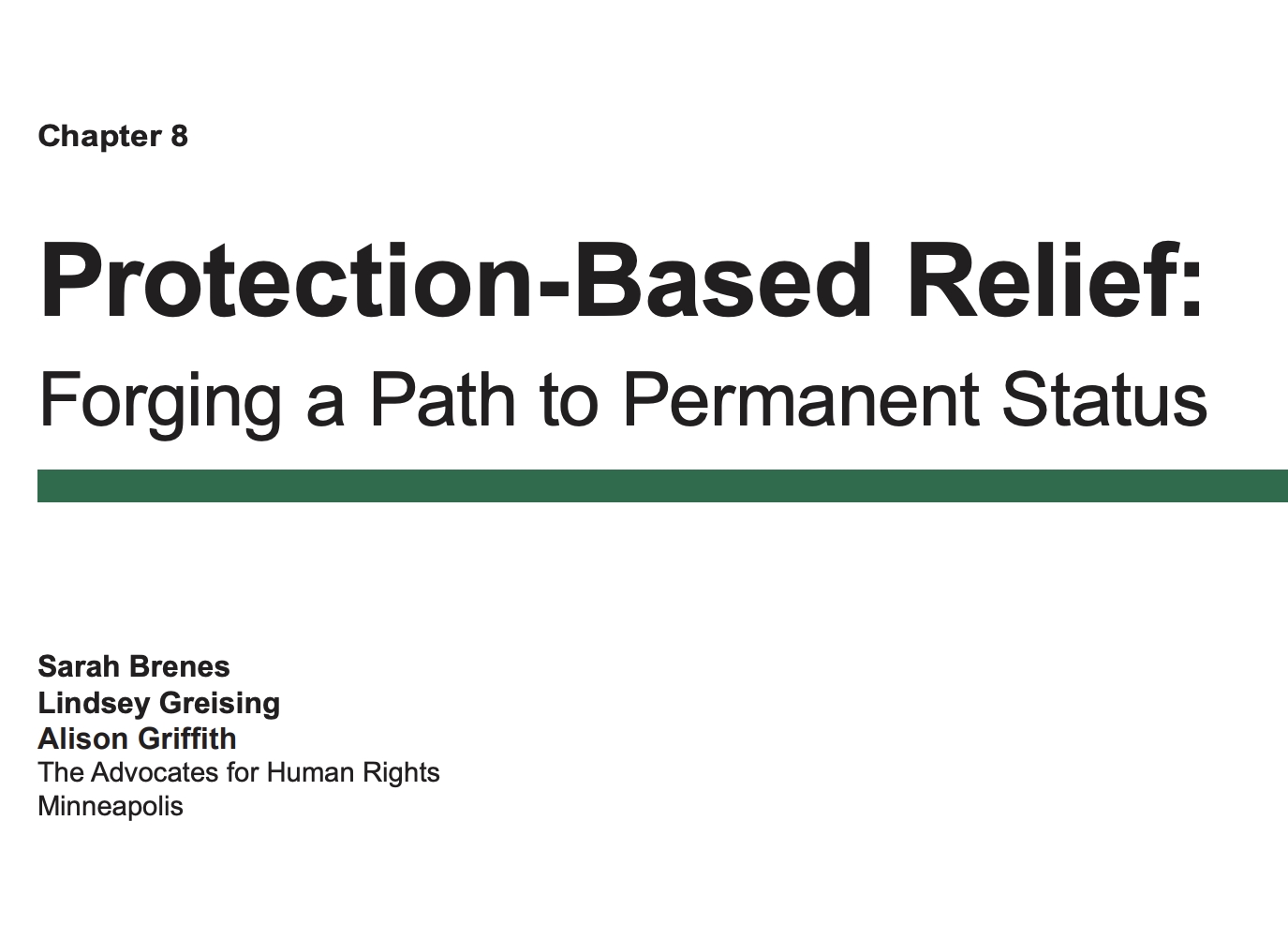 This chapter provides an overview of the basic forms of protection-based relief: asylum, withholding of removal, relief under the Convention Against Torture, T Nonimmigrant Status, U Nonimmigrant Status, and special immigrant juvenile status. You may download the full chapter or the relevant section.